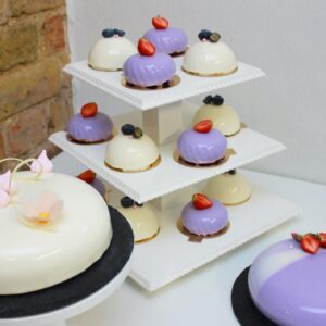 Daudzstāvu kāzu kūku statīvs paliktnis balts, koka kantains, 3 stāvi (noma)